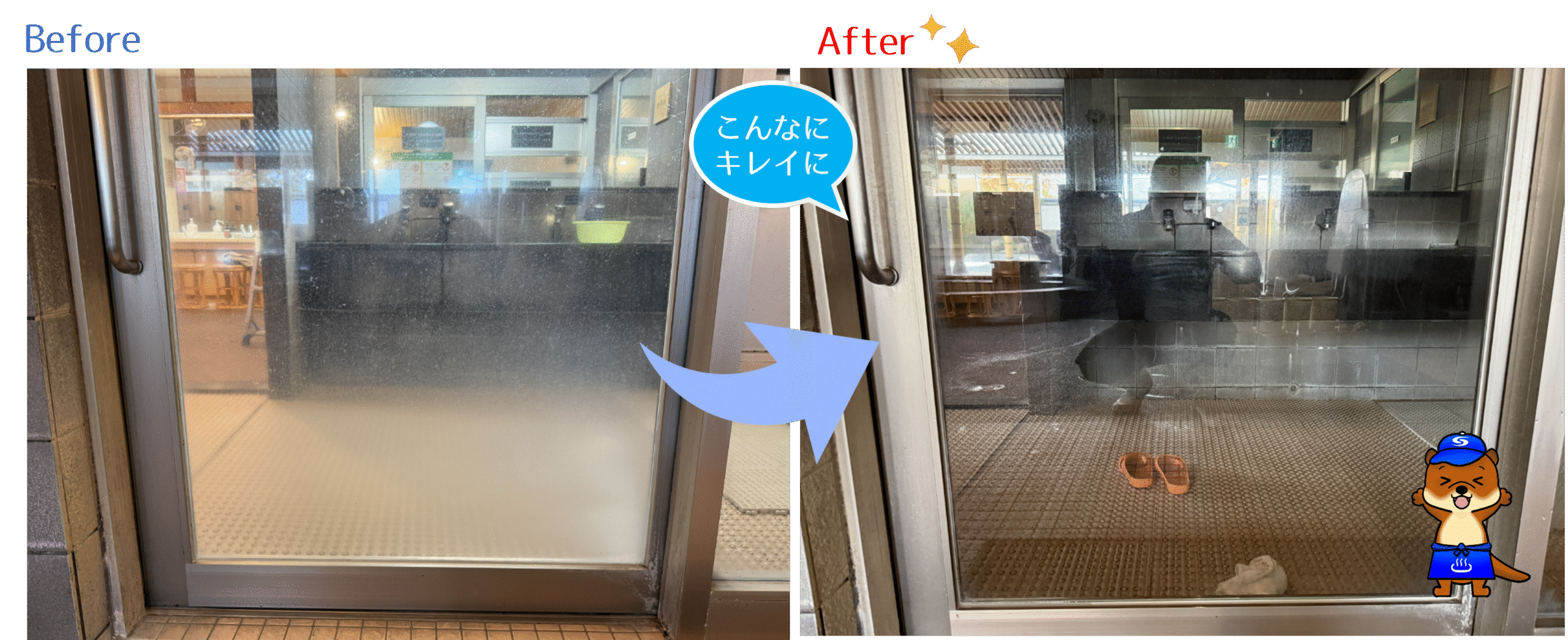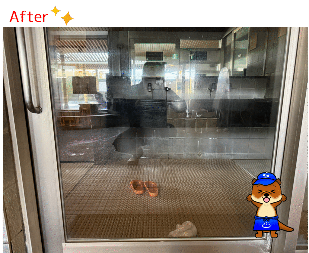 温浴施設にとって、入口の印象はとっても大切。今回ご依頼いただいたのは、天然温泉やサウナが充実し、アニメとのコラボイベントでも話題を集める人気施設様。月間4万人が訪れるこの施設で、脱衣所の出入口にある御影石とドアガラスの特殊清掃を行いました。