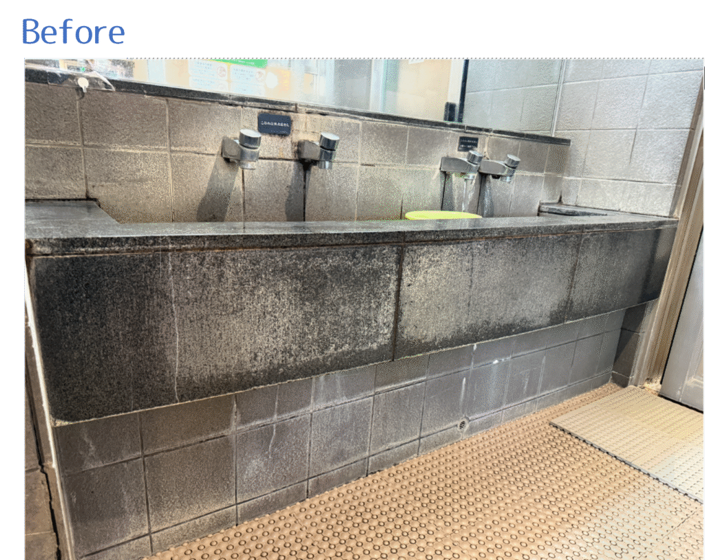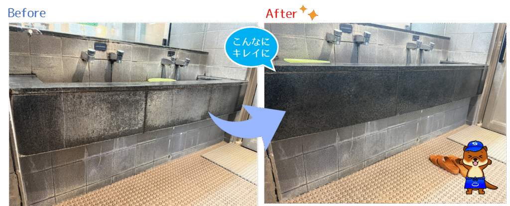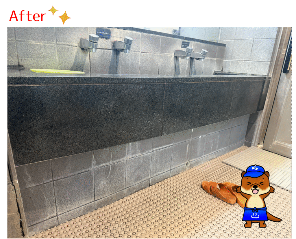 脱衣所の入口は、お客様が浴場に入る前に必ず通る場所。 ここがくもっていたり、石材がくすんでいたりすると、施設全体の印象にも影響してしまいます。